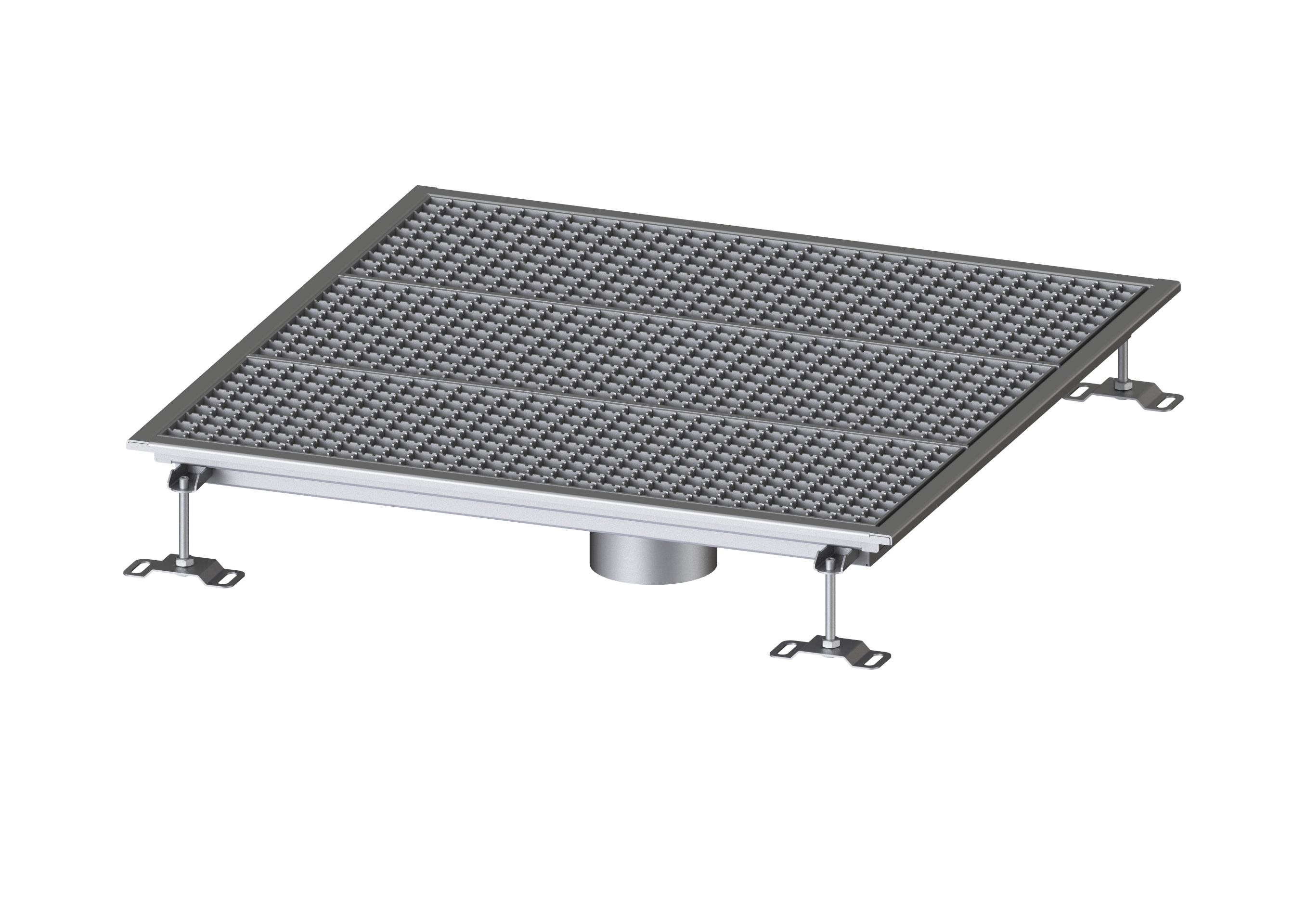 Die Bodenwanne Ferrofix aus Edelstahl mit einer Materialstärke von 2,0 mm (im Tauchbad gebeizt) ist mit geschliffenen Sichtstegen, Längs- und Quergefälle, Standfüßen zur Höhennivellierung sowie mit Auslaufstutzten aus Edelstahl ausgestattet.
