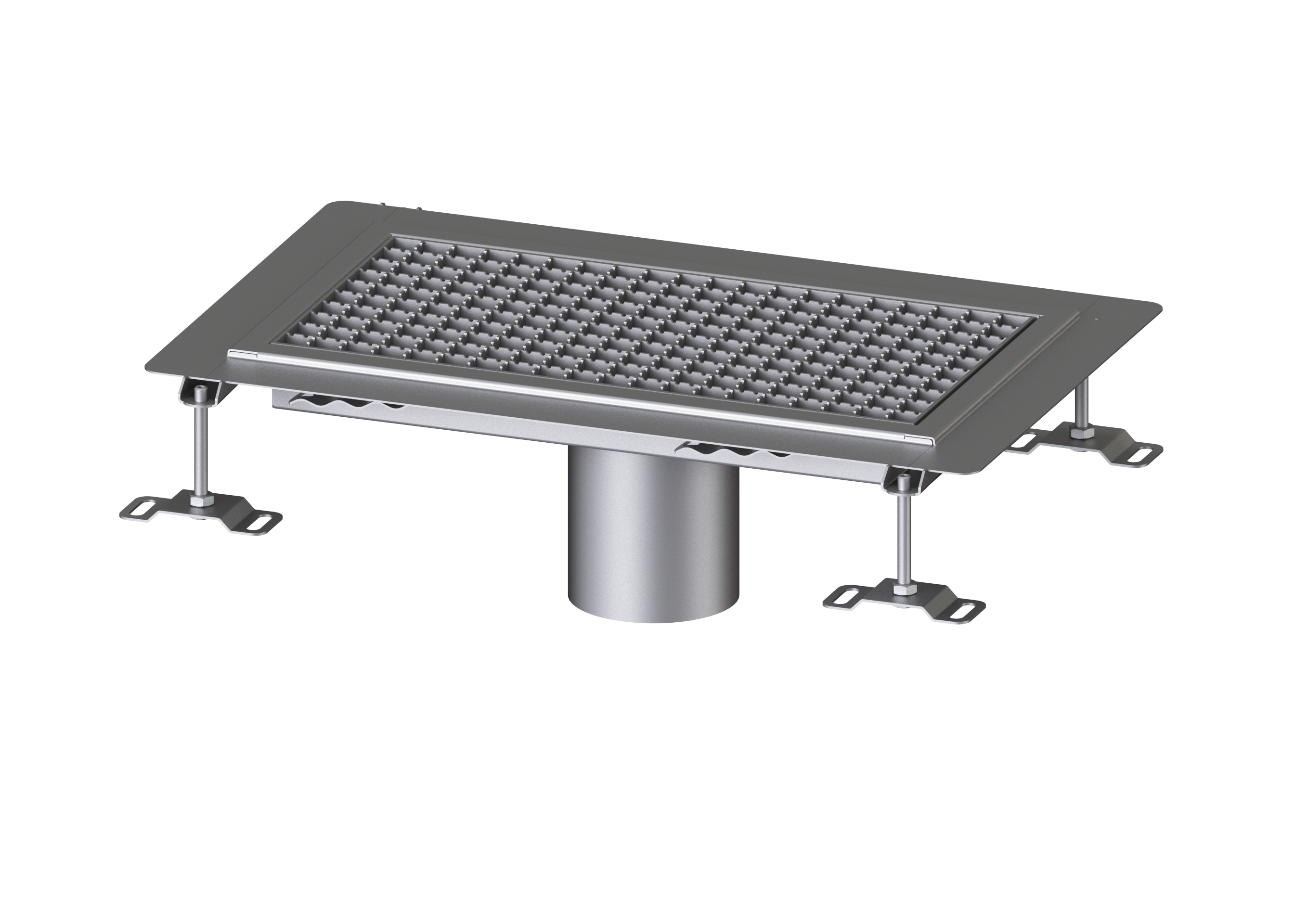 Die Kastenrinne Ferrofix aus Edelstahl mit einer Materialstärke von 1,5 mm (im Tauchbad gebeizt) ist mit geschliffenen Stichtstegen, Längs- und Quergefälle, Standfüßen zur Höhennievellierung sowie mit Auslaufstutzen aus Edelstahl ausgestattet. Das Rinnenprofil ist passend für dünnschichtige Bodenbeläge (z.B. Epoxydharz) und hat einen umlaufenden Kleberand (6 mm tief und 50 mm nach außen abgekantet) mit verschweißten Gehrungen. Der Klebeflansch ist auch geeignet zur Anbindung von Abdichtungen.