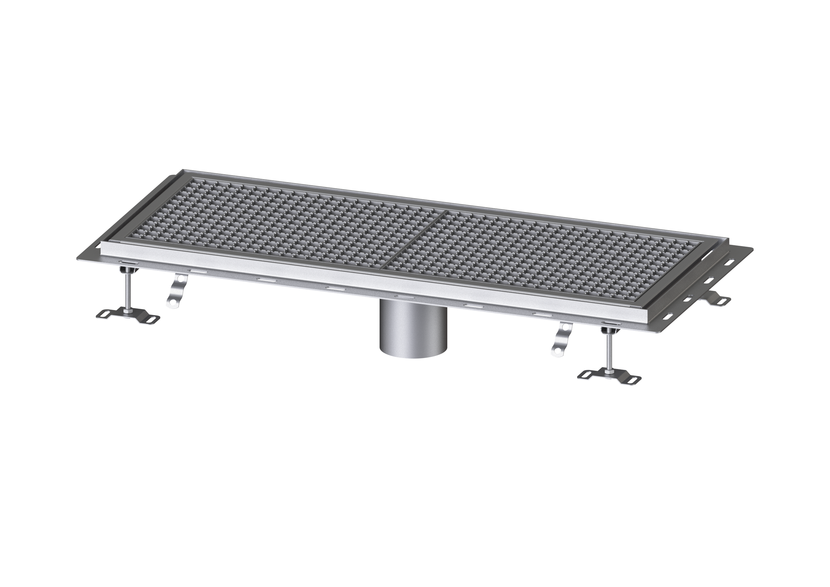 Die Kastenrinne Ferrofix aus Edelstahl mit einer Materialstärke von 2,0 mm (im Tauchbad gebeizt) ist mit geschliffenen Sichtstegen, Längs- und Quergefälle, Standfüßen zur Höhennivellierung sowie mit Auslaufstutzen aus Edelstahl ausgestattet. Das Rinnenprofil ist passend für thermisch hochbelastete Einbausituationen. Der Fliesenanschlusswinkel dient zum Schutz gegen Fliesenbruch im Randbereich.