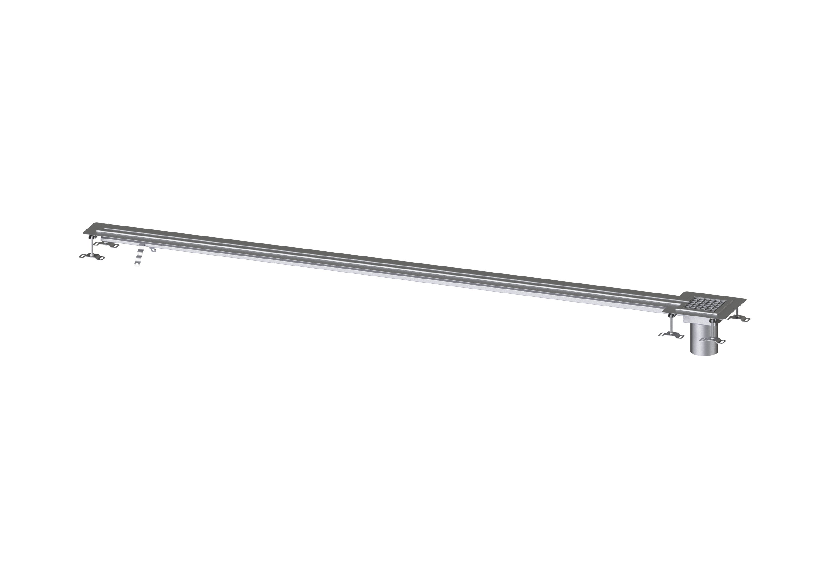 Die Schlitzrinne Ferrofix aus Edelstahl mit einer Materialstärke von 1,5 mm (im Tauchbad gebeizt) ist mit geschliffenen Stichtstegen, Längs- und Quergefälle, Standfüßen zur Höhennievellierung sowie mit Auslaufstutzen aus Edelstahl ausgestattet. Das Rinnenprofil ist passend für dünnschichtige Bodenbeläge (z.B. Epoxydharz) und hat einen umlaufenden Kleberand (6 mm tief und 50 mm nach außen abgekantet) mit verschweißten Gehrungen. Der Klebeflansch ist auch geeignet zur Anbindung von Abdichtungen.