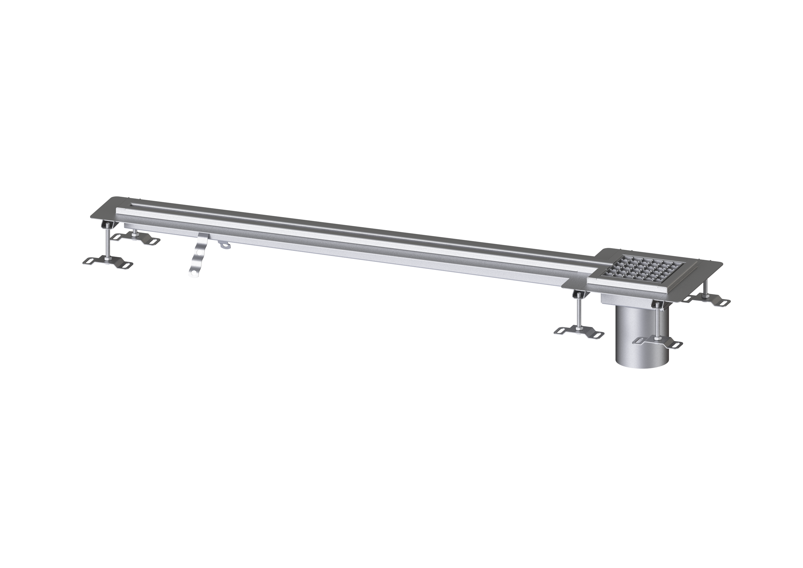 Die Schlitzrinne Ferrofix aus Edelstahl mit einer Materialstärke von 2,0 mm (im Tauchbad gebeizt) ist mit geschliffenen Sichtstegen, Längs- und Quergefälle, Standfüßen zur Höhennivellierung sowie mit Auslaufstutzten aus Edelstahl ausgestattet. Das Rinnenprofil ist passend für Abdichtung im Verbund und hat einen umlaufenden Kleberand (15 mm tief und 50 mm nach außen abgekantet) mit verschweißten Gehrungen. Der Klebeflansch ist geeignet zur Anbindung von Abdichtungen im Verbund, gemäß DIN 18534, für alle Wassereinwirkungsklassen.