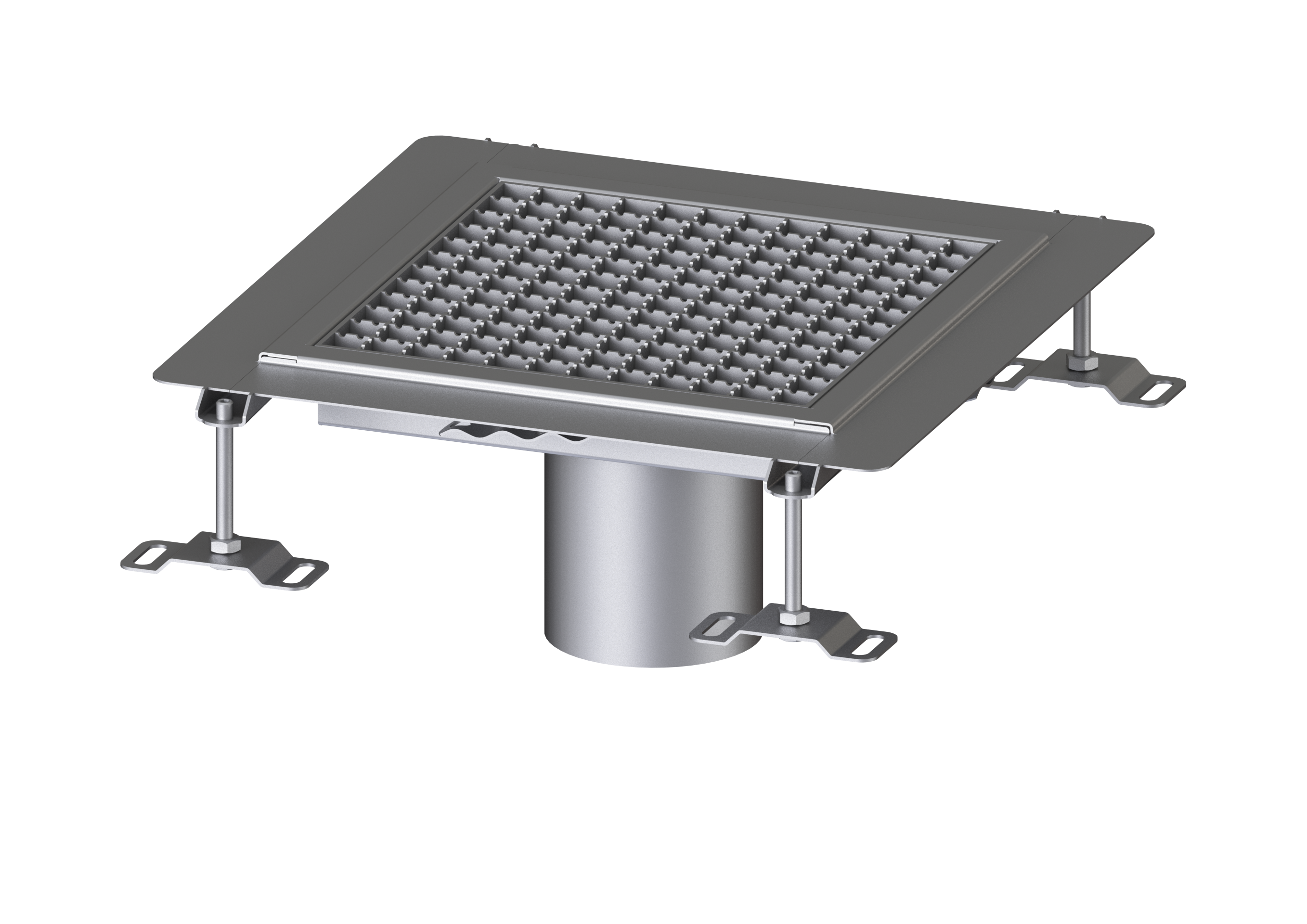 Die Bodenwanne Ferrofix aus Edelstahl mit einer Materialstärke von 1,5 mm (im Tauchbad gebeizt) ist mit geschliffenen Stichtstegen, Längs- und Quergefälle, Standfüßen zur Höhennievellierung sowie mit Auslaufstutzen aus Edelstahl ausgestattet. Das Rinnenprofil ist passend für dünnschichtige Bodenbeläge (z.B. Epoxydharz) und hat einen umlaufenden Kleberand (6 mm tief und 50 mm nach außen abgekantet) mit verschweißten Gehrungen. Der Klebeflansch ist auch geeignet zur Anbindung von Abdichtungen.