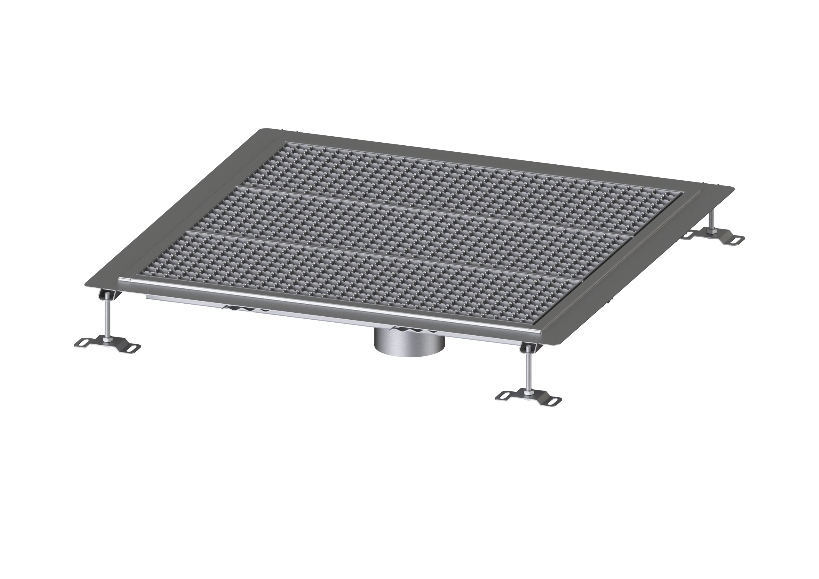 Die Bodenwanne Ferrofix aus Edelstahl mit einer Materialstärke von 1,5 mm (im Tauchbad gebeizt) ist mit geschliffenen Stichtstegen, Längs- und Quergefälle, Standfüßen zur Höhennievellierung sowie mit Auslaufstutzen aus Edelstahl ausgestattet. Das Rinnenprofil ist passend für dünnschichtige Bodenbeläge (z.B. Epoxydharz) und hat einen umlaufenden Kleberand (6 mm tief und 50 mm nach außen abgekantet) mit verschweißten Gehrungen. Der Klebeflansch ist auch geeignet zur Anbindung von Abdichtungen.