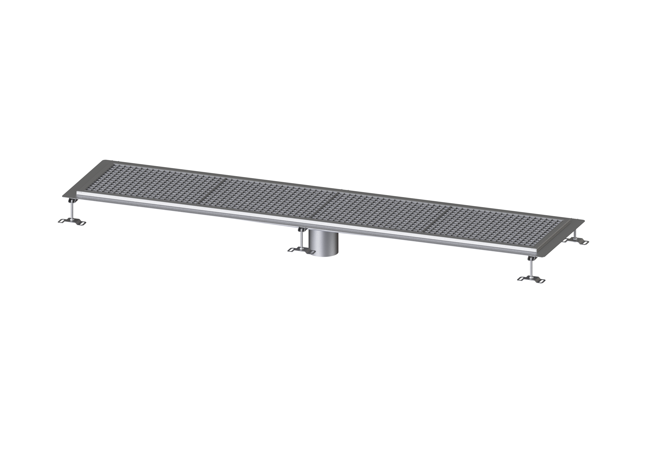 Die Kastenrinne Ferrofix aus Edelstahl mit einer Materialstärke von 2,0 mm (im Tauchbad gebeizt) ist mit geschliffenen Sichtstegen, Längs- und Quergefälle, Standfüßen zur Höhennivellierung sowie mit Auslaufstutzten aus Edelstahl ausgestattet. Das Rinnenprofil ist passend für Abdichtung im Verbund und hat einen umlaufenden Kleberand (15 mm tief und 50 mm nach außen abgekantet) mit verschweißten Gehrungen. Der Klebeflansch ist geeignet zur Anbindung von Abdichtungen im Verbund, gemäß DIN 18534, für alle Wassereinwirkungsklassen.