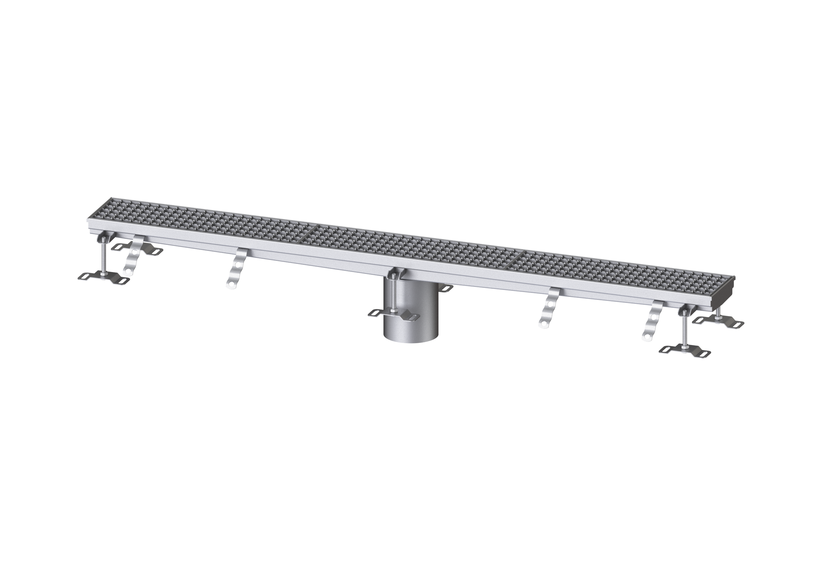 Die Kastenrinne Ferrofix aus Edelstahl mit einer Materialstärke von 2,0 mm (im Tauchbad gebeizt) ist mit geschliffenen Sichtstegen, Längs- und Quergefälle, Standfüßen zur Höhennivellierung sowie mit Auslaufstutzten aus Edelstahl ausgestattet.