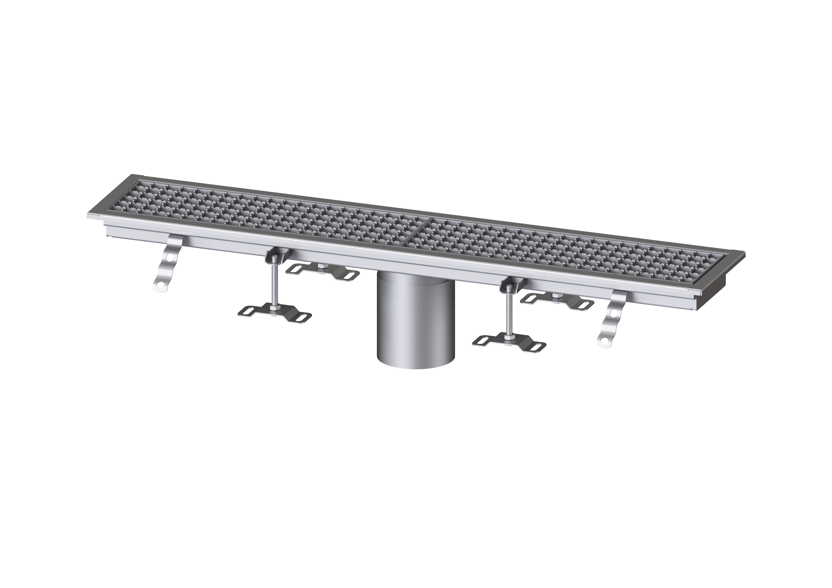 Die Kastenrinne Ferrofix aus Edelstahl mit einer Materialstärke von 2,0 mm (im Tauchbad gebeizt) ist mit geschliffenen Sichtstegen, Längs- und Quergefälle, Standfüßen zur Höhennivellierung sowie mit Auslaufstutzten aus Edelstahl ausgestattet.