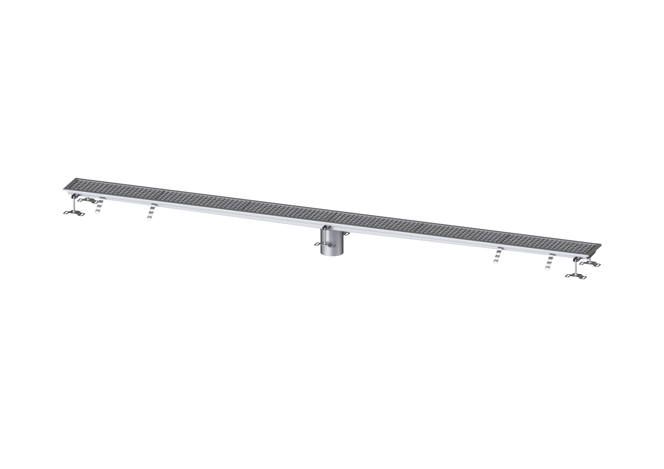 Die Kastenrinne Ferrofix aus Edelstahl mit einer Materialstärke von 2,0 mm (im Tauchbad gebeizt) ist mit geschliffenen Sichtstegen, Längs- und Quergefälle, Standfüßen zur Höhennivellierung sowie mit Auslaufstutzten aus Edelstahl ausgestattet.