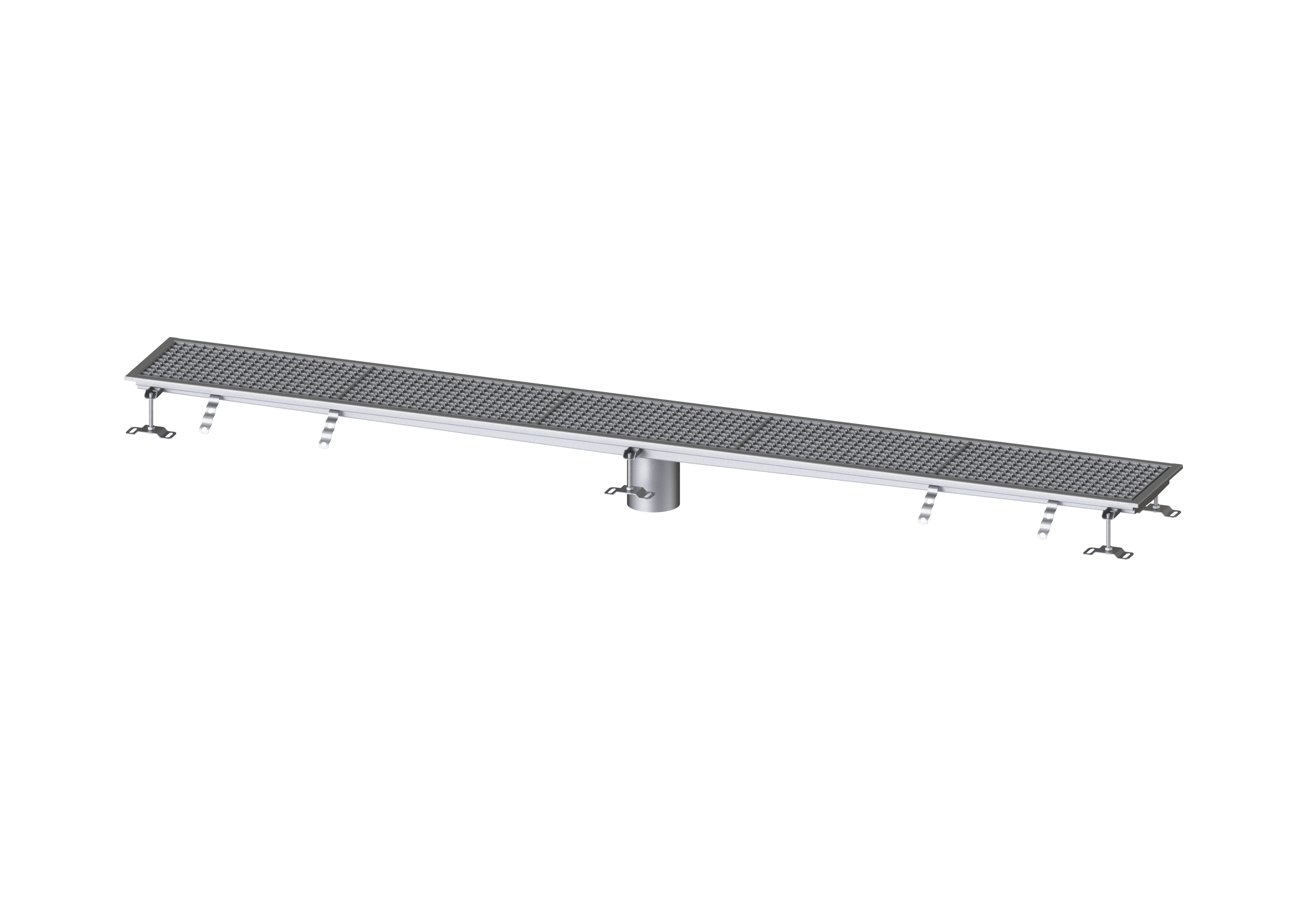 Die Kastenrinne Ferrofix aus Edelstahl mit einer Materialstärke von 2,0 mm (im Tauchbad gebeizt) ist mit geschliffenen Sichtstegen, Längs- und Quergefälle, Standfüßen zur Höhennivellierung sowie mit Auslaufstutzten aus Edelstahl ausgestattet.