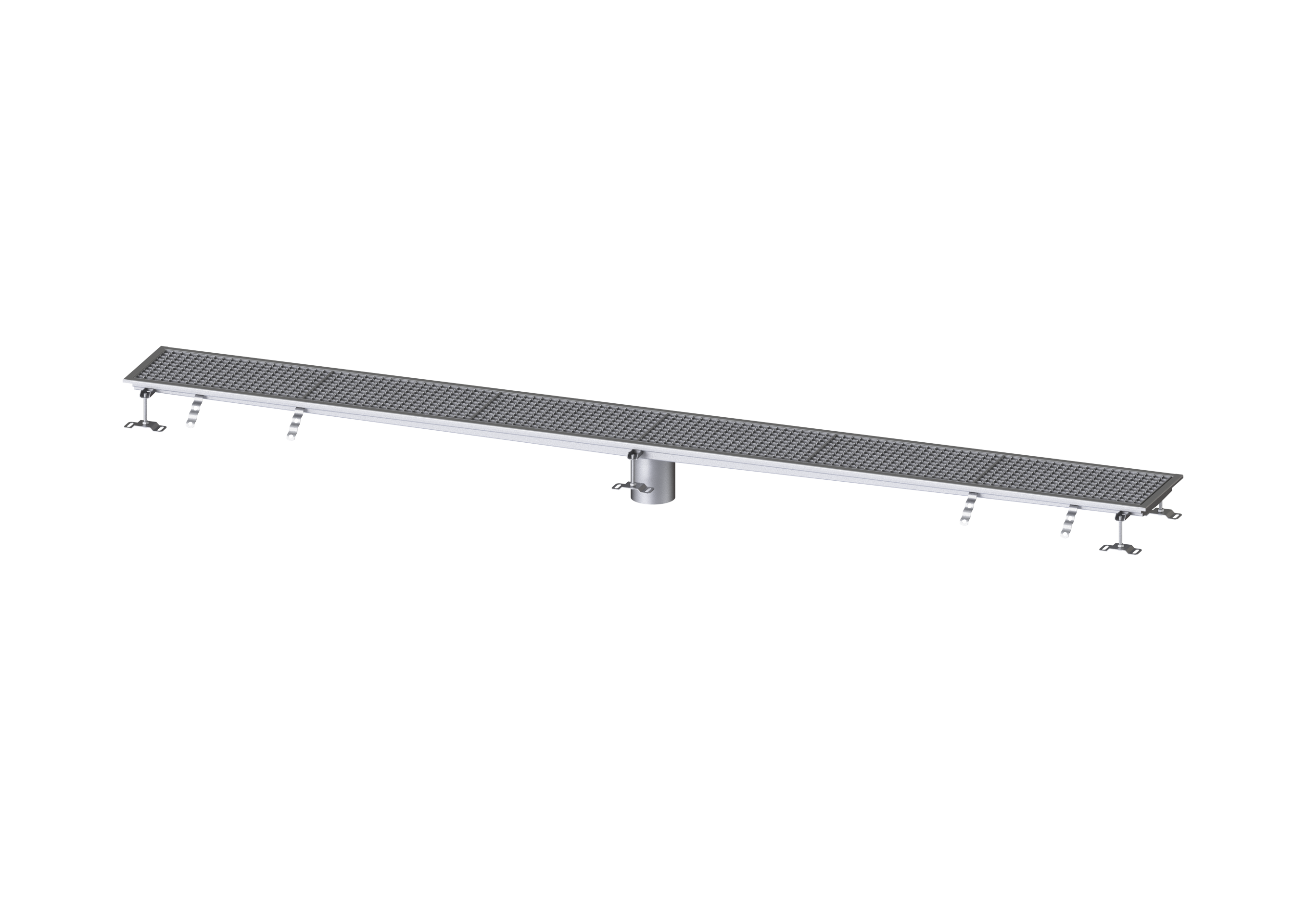Die Kastenrinne Ferrofix aus Edelstahl mit einer Materialstärke von 2,0 mm (im Tauchbad gebeizt) ist mit geschliffenen Sichtstegen, Längs- und Quergefälle, Standfüßen zur Höhennivellierung sowie mit Auslaufstutzten aus Edelstahl ausgestattet.