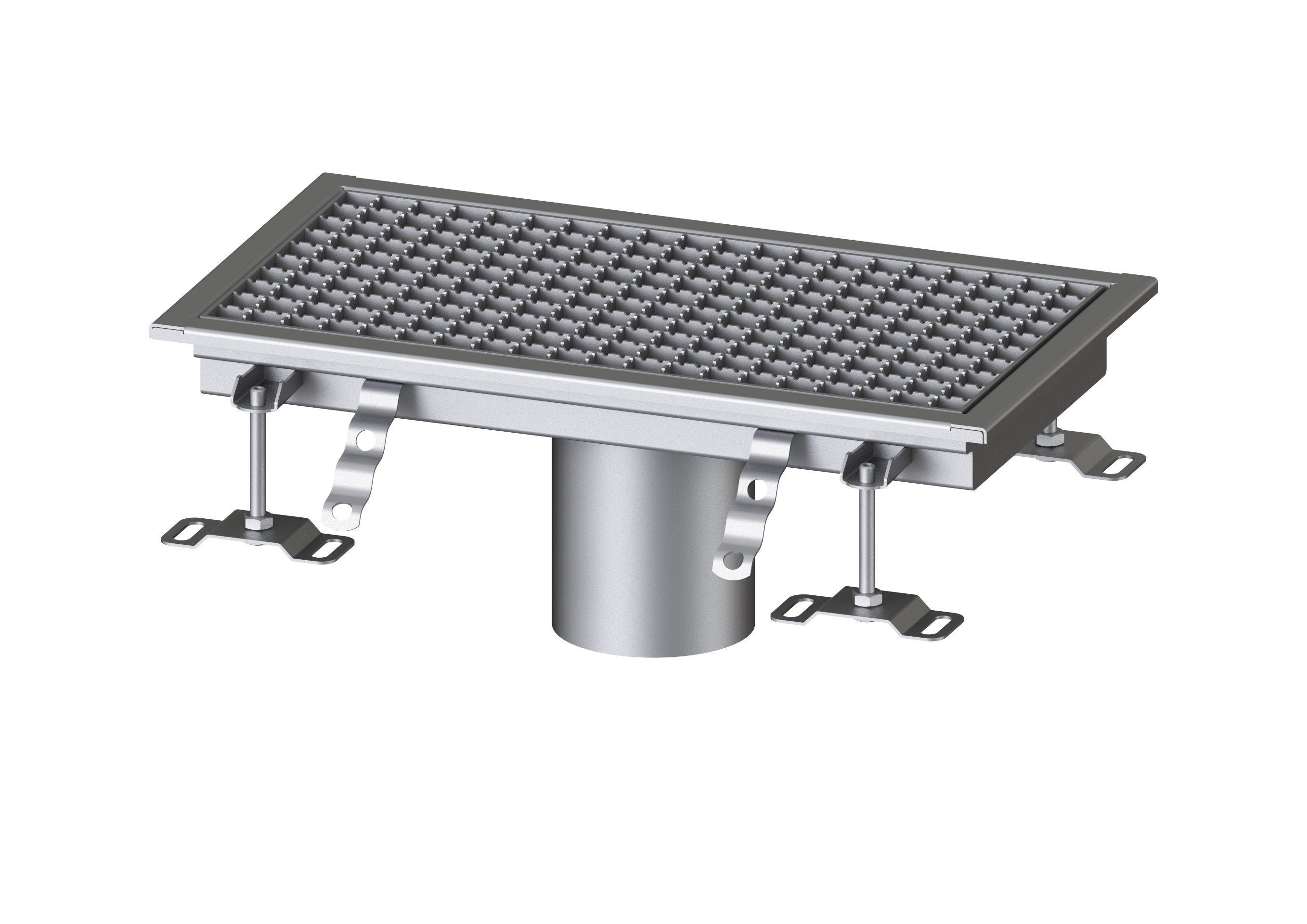 Die Kastenrinne Ferrofix aus Edelstahl mit einer Materialstärke von 2,0 mm (im Tauchbad gebeizt) ist mit geschliffenen Sichtstegen, Längs- und Quergefälle, Standfüßen zur Höhennivellierung sowie mit Auslaufstutzten aus Edelstahl ausgestattet.