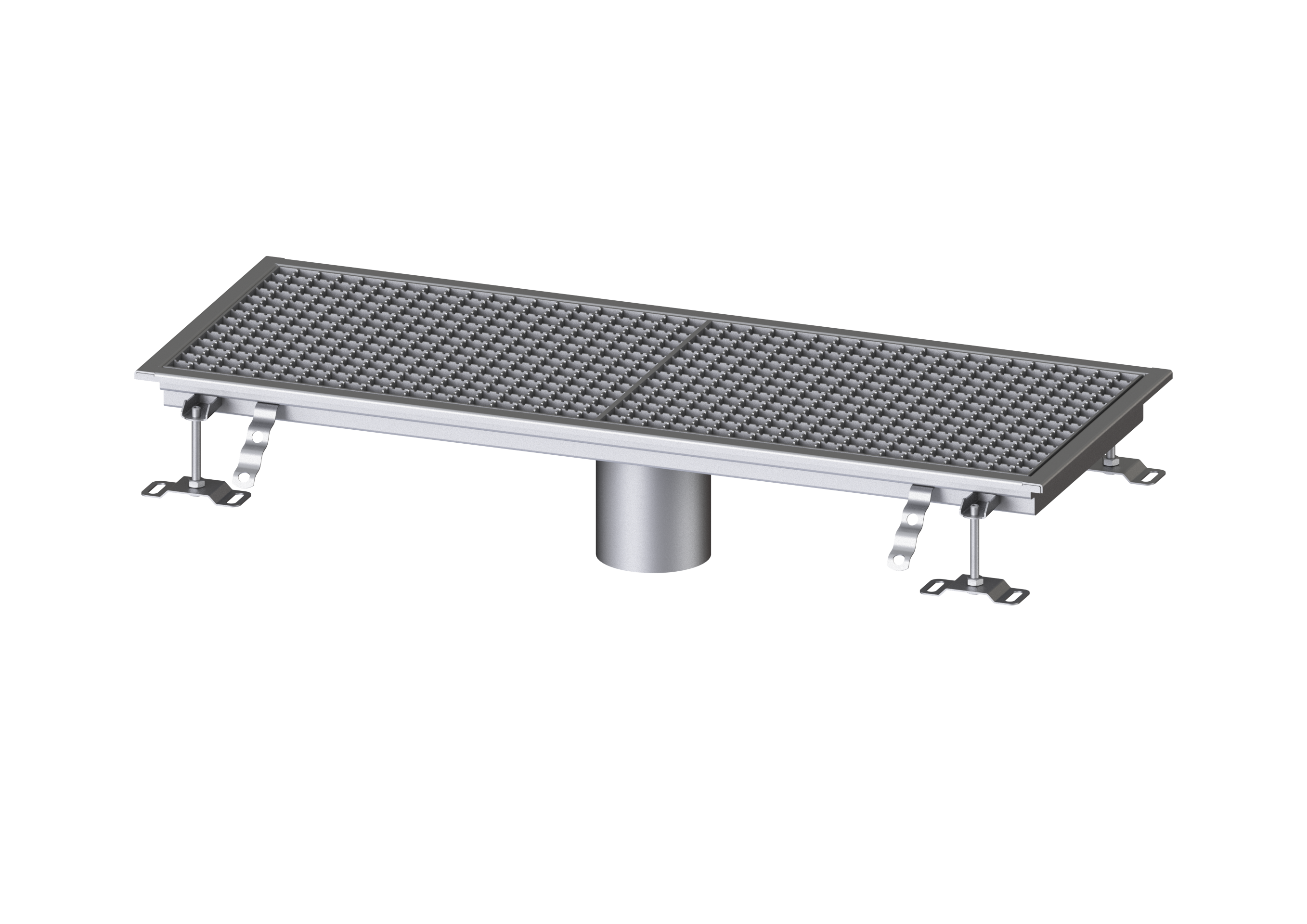 Die Kastenrinne Ferrofix aus Edelstahl mit einer Materialstärke von 2,0 mm (im Tauchbad gebeizt) ist mit geschliffenen Sichtstegen, Längs- und Quergefälle, Standfüßen zur Höhennivellierung sowie mit Auslaufstutzten aus Edelstahl ausgestattet.