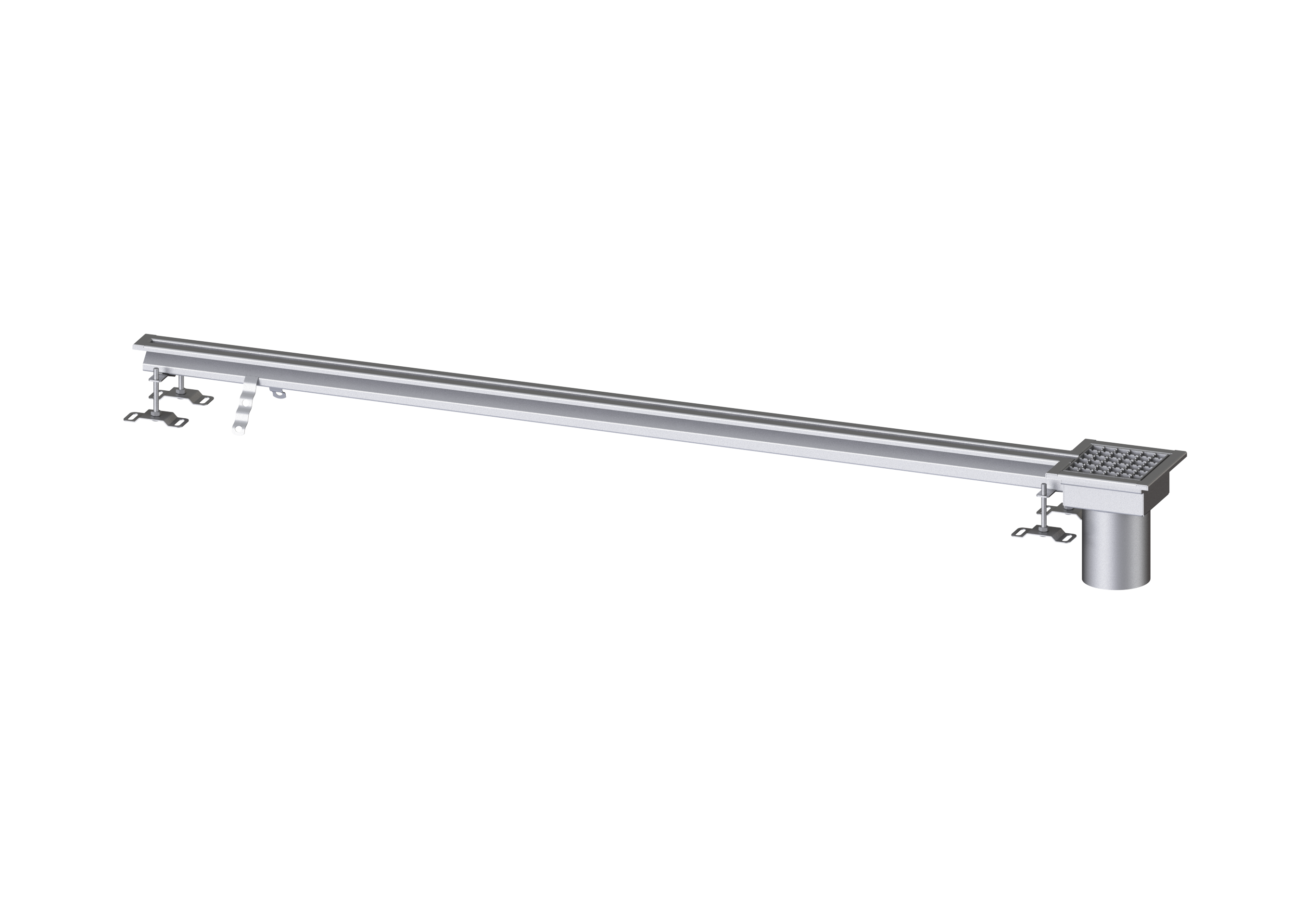 Die Schlitzrinne Ferrofix aus Edelstahl mit einer Materialstärke von 2,0 mm (im Tauchbad gebeizt) ist mit geschliffenen Sichtstegen, Längs- und Quergefälle, Standfüßen zur Höhennivellierung sowie mit Auslaufstutzten aus Edelstahl ausgestattet.