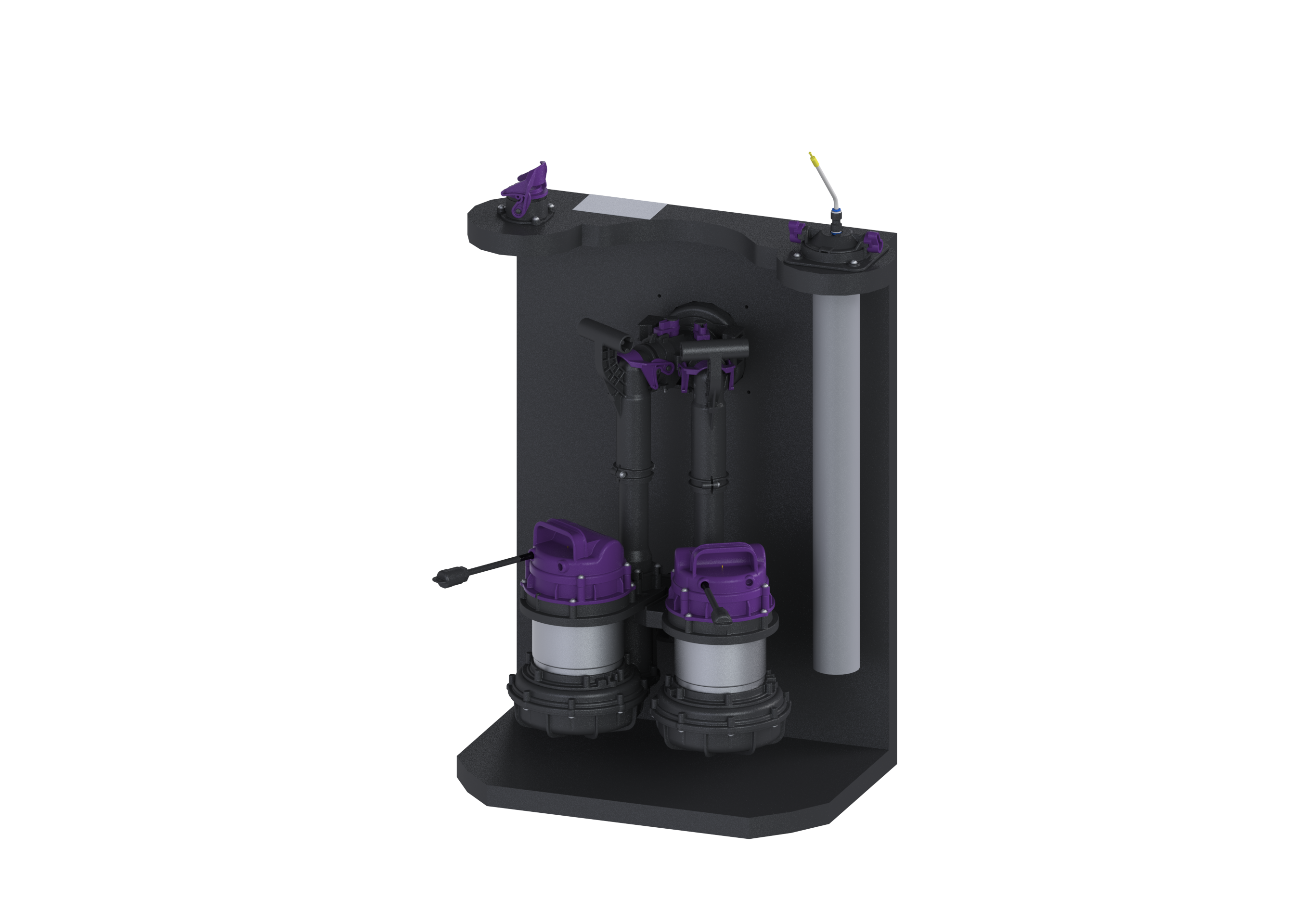 Die Pumpanlage zum Einbau in bestehende Sammelbehälter für fäkalienfreies Abwasser ist mit zwei überflutbaren Pumpen, einem Rückflussverhinderer sowie einer Handverriegelung ausgestattet. Das Halteprofil aus Kunststoff (PE) dient zur Montage und Fixierung der Pumpanlage. Schnellverschlüsse ermöglichen die einfache Entnahme der Pumpen. Die Steuerung erfolgt durch ein anwenderfreundliches Schaltgerät, das optional über einen potentialfreien Kontakt in die Gebäudeleittechnik eingebunden werden oder Alarm- und Sammelstörmeldungen über eine GSM- Schnittstelle ausgeben kann.