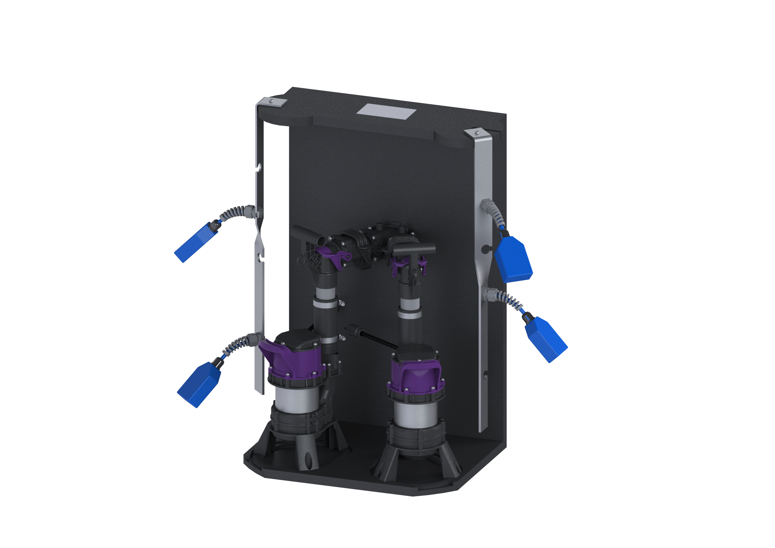 Die Pumpanlage zum Einbau in bestehende Sammelbehälter für fäkalienfreies Abwasser ist mit zwei überflutbaren Pumpen, einem Rückflussverhinderer sowie einer Handverriegelung ausgestattet. Das Halteprofil aus Kunststoff (PE) dient zur Montage und Fixierung der Pumpanlage. Schnellverschlüsse ermöglichen die einfache Entnahme der Pumpen. Die Steuerung erfolgt mittels Schwimmerschalter durch ein anwenderfreundliches Schaltgerät, das optional über einen potentialfreien Kontakt in die Gebäudeleittechnik eingebunden werden oder Alarm- und Sammelstörmeldungen über eine GSM-Schnittstelle ausgeben kann.