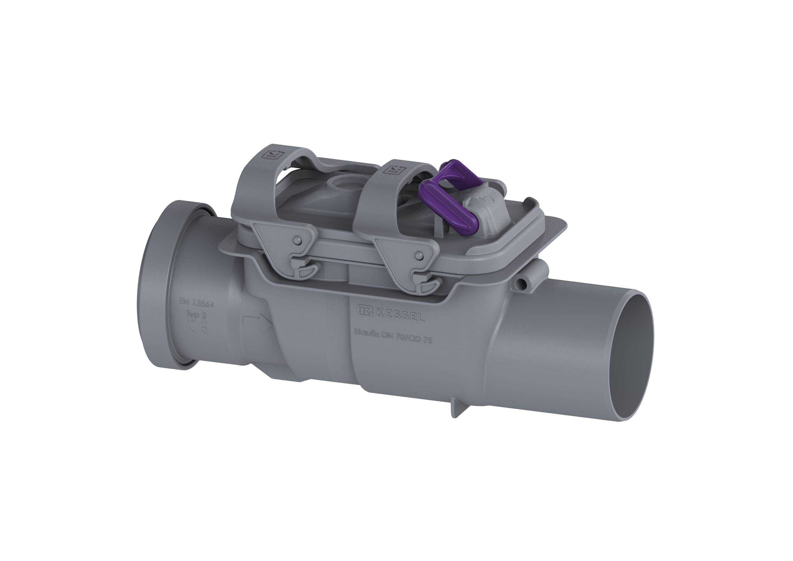 Der Rückstauverschluss für fäkalienfreies Abwasser ist mit zwei mechanischen Klappen ausgestattet, die bei Rückstau selbsttätig schließen. Eine Klappe dient gleichzeitig als handverriegelbarer Notverschluss.