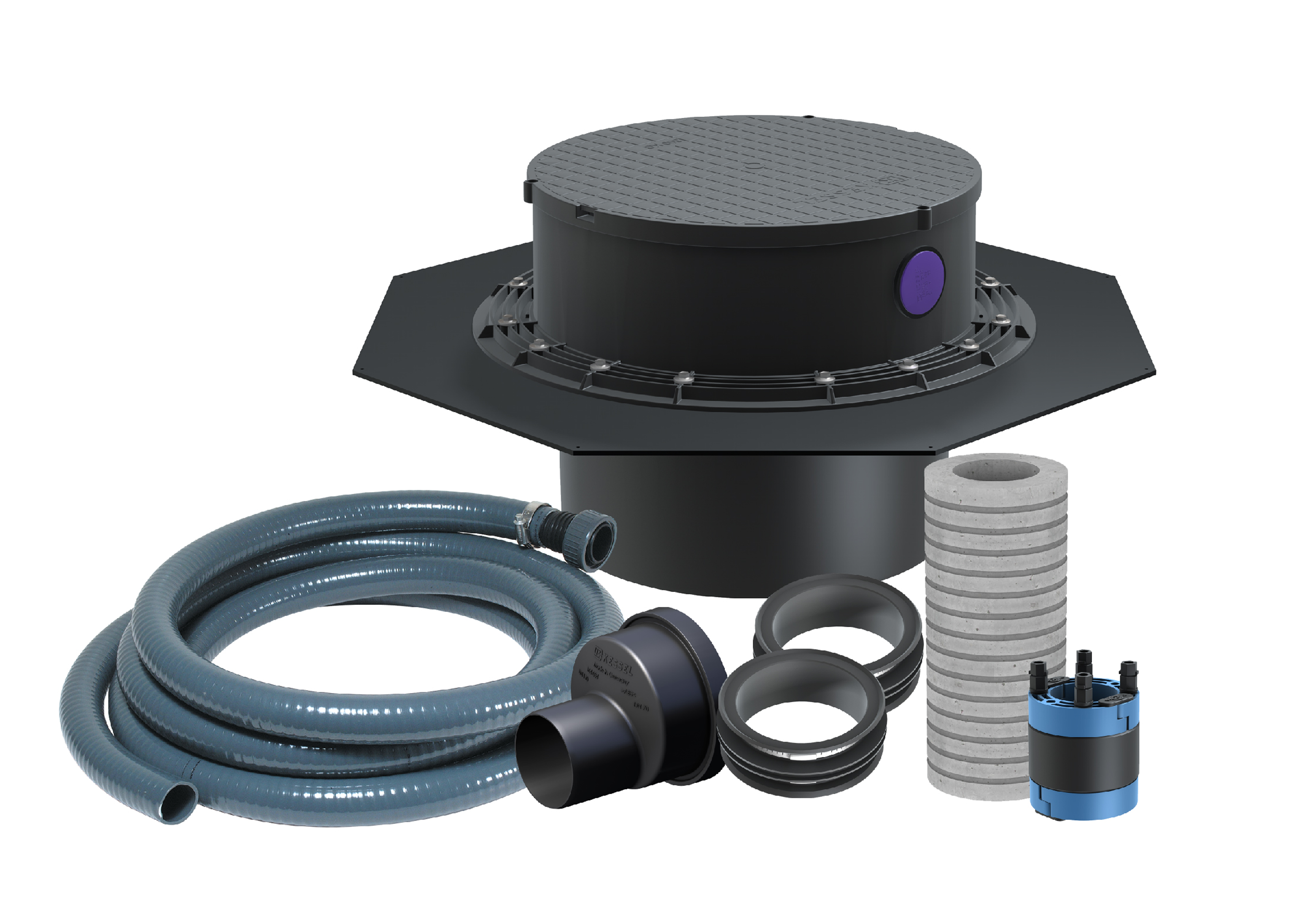 WU-Einbauset für Bauunternehmer zur Verwendung bei KESSEL-Hebeanlagen Aqualift Compact und Rückstauhebeanlagen Ecolift im Verbau mit WU-Betonplatten, bestehend aus Verlängerungsstück (zur Verlängerung um max. 360 mm, inkl. verschraubter elastomerer Sperrbahn aus NK/SBR, Dichtung für Aufsatzstück und Bauzeitschutzabdeckung aus Kunststoff), mittigem WU-Flansch, Druckleitungsset, Mauerkragen, Futterrohr inkl. Ringraumdichtung für Druckschlauch und Übergangsstück für Entlüftungsleitung. Muss bei Aqualift S bauseitig angebohrt werden.