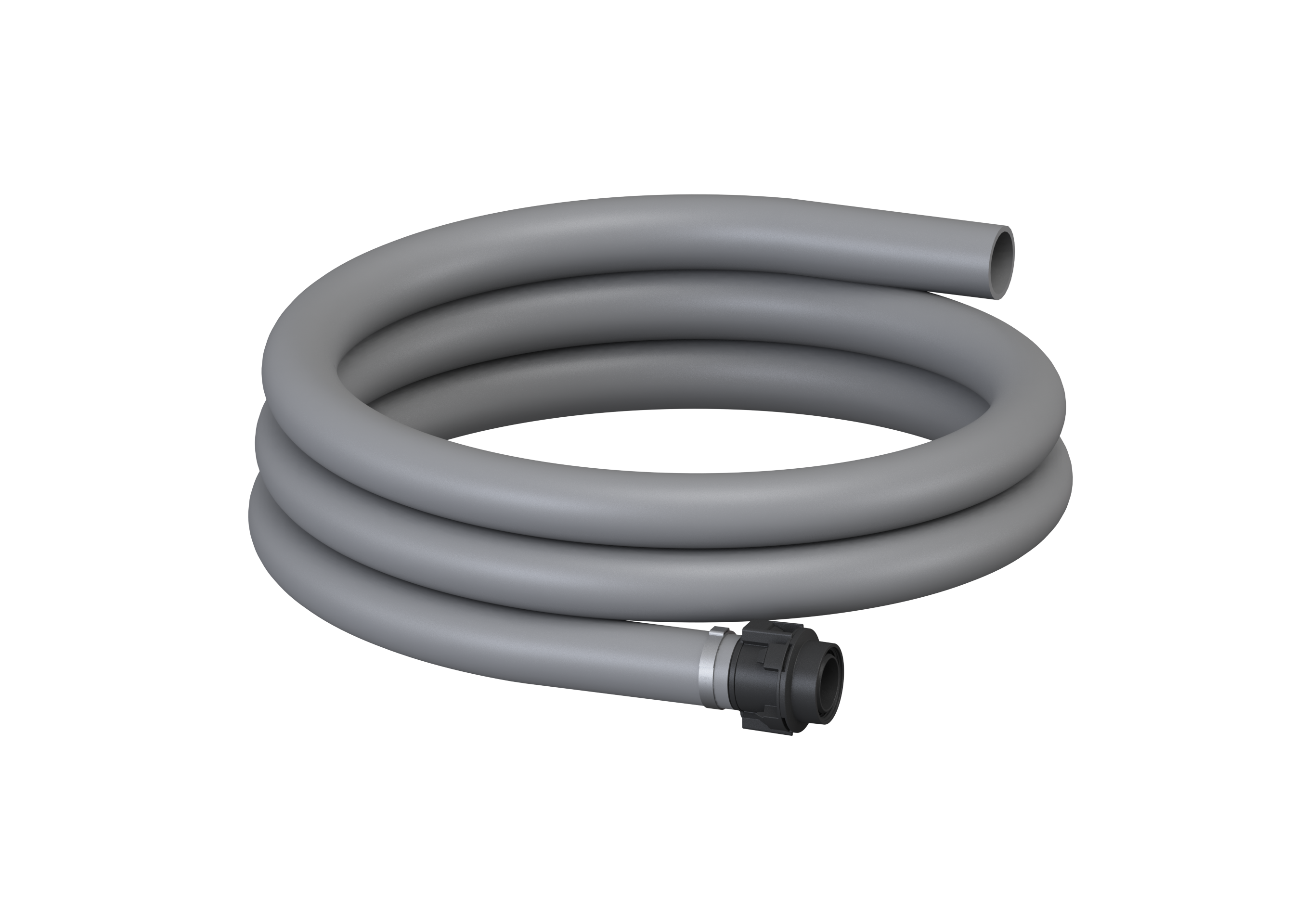 Druckleitungsset mit 5 m Druckleitungsschlauch zum Anschluss an Hebeanlagen für den Einbau in die Bodenplatte, bestehend aus einem flexiblen PVC-Druckschlauch mit Verstärkungsspiralen sowie einem Adapter zum Anschluss an die Hebeanlage.